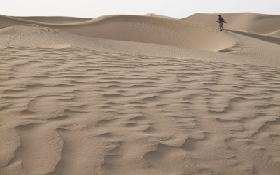 There are many dried Populus tress still stand on the desert, refuse to accept their fate even after thousand years, beautiful as it is, I don't find the combination of desert and Populus tree here a particular nice composition, so I made some images, mostly without it. Here, I took one picture for Pook (with her G10), before walking into desert to find my view.And some of the shots made in the desert, Nikon D3X with AF-S 24-70/2.8G ED. One note to Nikon here: Please! Even the dusk removing mechanism is not perfect on every other camera system, with something is still better than nothing. I got a big problem after coming back to hotel to find some images were good but useless because of dusts. Yes, Photoshop is a solution, but not a solution to the problem I found. I kept walking, although try to be careful of my bearing, really there is nothing to register in desert, but, with camera on my hand, I continue to move on, while sun is setting, this one, also with Nikon D3X with AF-S 24-70/2.8G ED. And some shots from my pocket camera, Sigma DP-1.This one, shot with Nikon D3X, reminds me it was late in the night, now I have to find my way out.I thought it is easy, but it isn't. I tried to calm down myself, try to find the direction, not panic, and I heard some faint voice calling my name, so I follow the voice, back to join the team, and most importantly, my wife. And it was 10pm already. And this becomes sort of the routine, get up early, long drive, taking pictures, late dinner. It is almost 10:30pm when we order our dinner, but compare to the days at Bayanbulak, this is not late at all. Retire to the hotel room, it was late, and while backing up the day's pictures, pleasantly surprised that Pook's Canon G10 captures some nice images of myself, and of course the scenery.My steps? Captured by Pook with her G10.To me, Pook's shot of the day with her Canon G10.